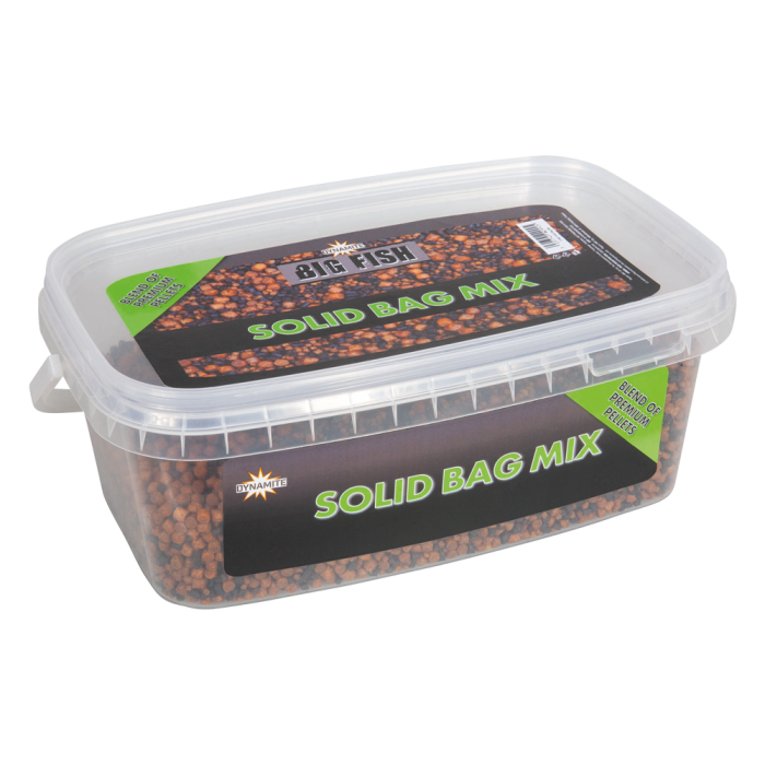 Dynamite Baits Big Fish Solid Bag Mix 2L, Several mixed pellets of different sizes, type & colour. Pellet blend has different breakdown times. Perfect for creating a concentrated area of high attraction. Keeps the fish searching through the feed longer. Ideal for filling all the corners of a solid PVA bag.