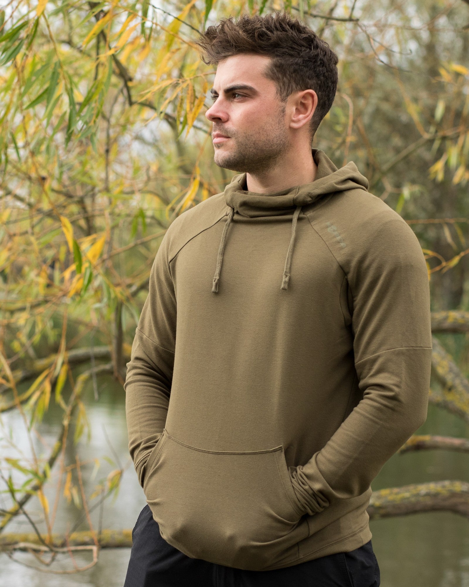 The hoodie is made from a mixture of cotton/polyester/spandex which allows it to be fairly snug fitting and tailored to the shape of a typical upper body, whilst at the same time allowing complete freedom of movement, which is essential when casting, etc.