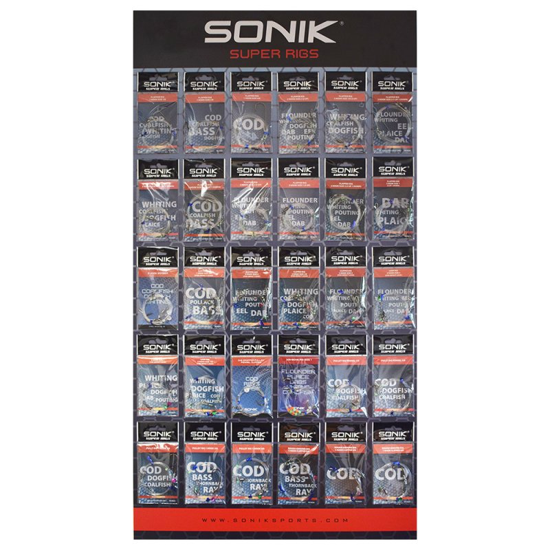 Sonik Super Rigs - Better than you can tie yourself Catch more fish with Sonik Super Rigs - a superb range of thirty custom sea rigs, hand tied to exacting standards. Each one is carefully tailored to suit specific species, baits and fishing conditions. Fish smart...Fish Sonik 3 Hook Flapper (2UP1D) Rigs: Two hooks positioned above the lead and one hook below. Available in hook sizes 1 and 2, ideal for catching smaller species such as Dabs, Plaice, Eels, Whiting or Pouting.